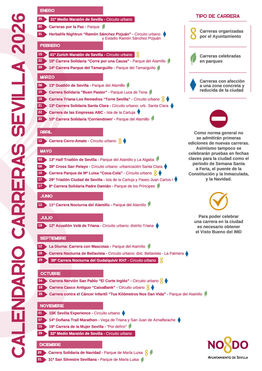 Así, en 2026 la única carrera que tendrá lugar entre Semana Santa y Feria será la del distrito Cerro Amate, que discurrirá principalmente en el entorno del Parque Amate, mientras que en Navidad solamente se celebrarán la Carrera de Navidad y la San Silvestre Sevillanas, ambas en el Parque de María Luisa.