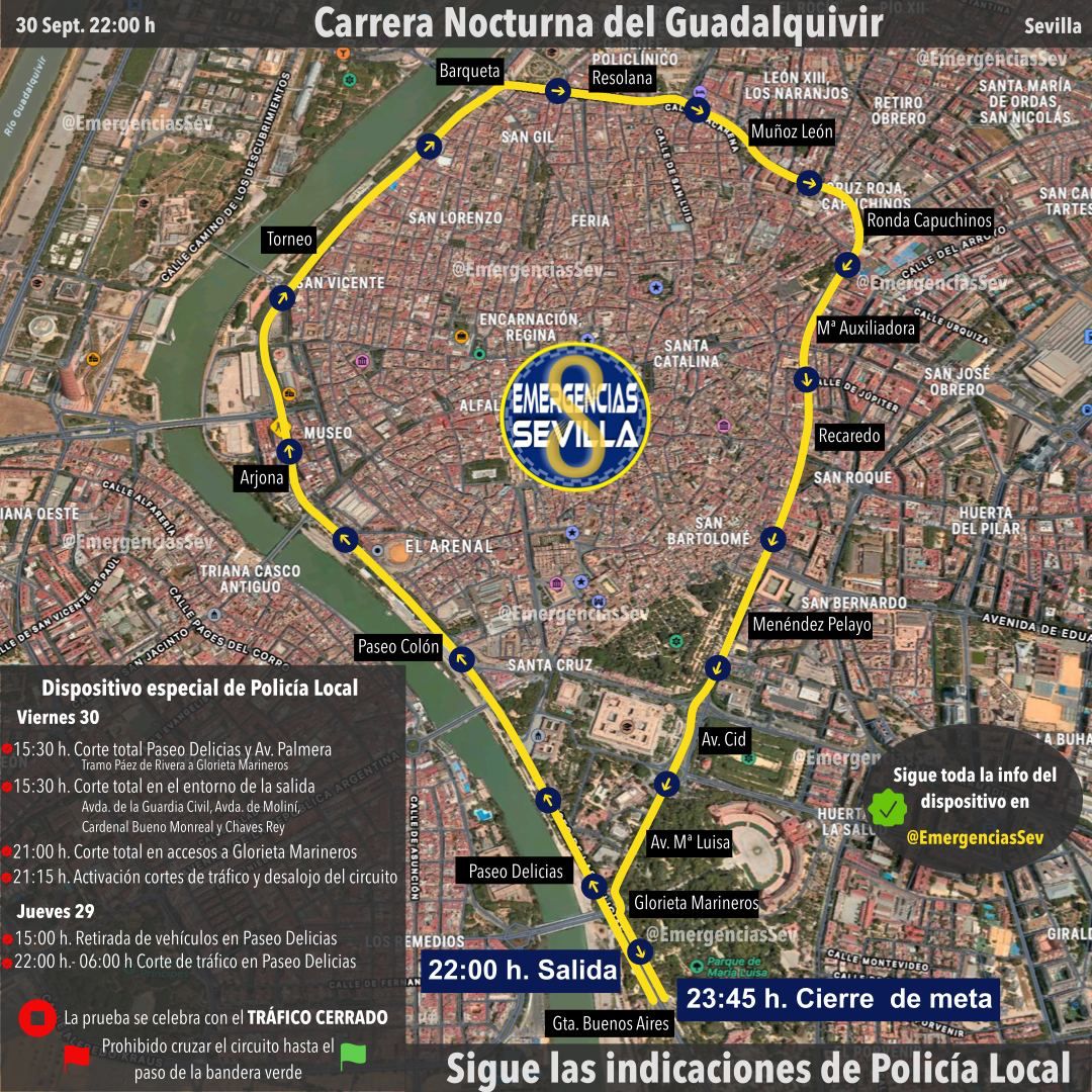 El Ayuntamiento de Sevilla, a través de la coordinación de la Delegación de Gobernación y Fiestas Mayores y en colaboración con el Instituto Municipal de Deportes, Tussam, Lipasam y el resto de delegaciones, ha diseñado un dispositivo especial de movilidad y seguridad con motivo de la celebración de la KH-7 Carrera Nocturna del Guadalquivir que se mantendrá hasta la finalización de la prueba y retirada de materiales.