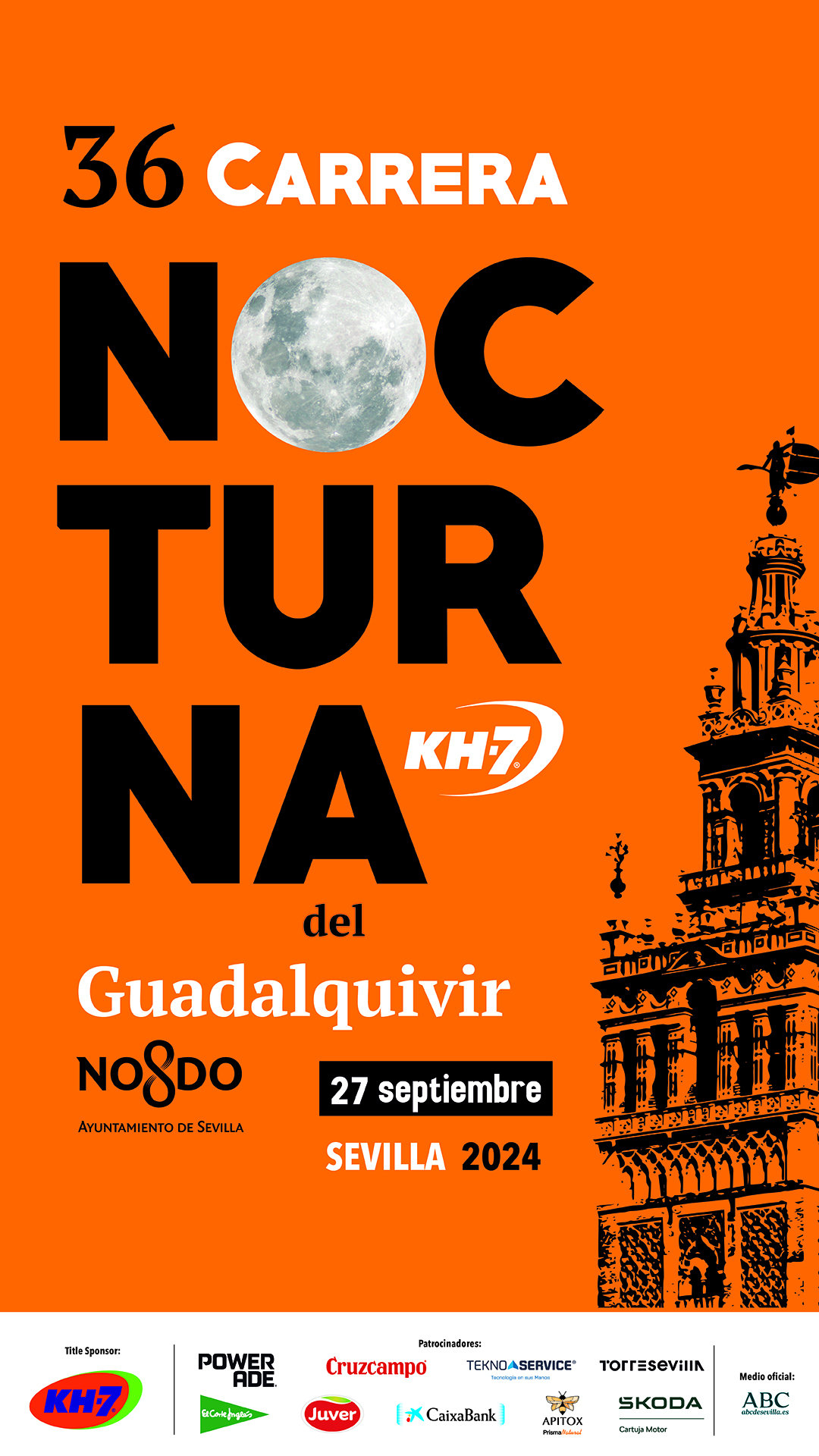La XXXVI Carrera Nocturna del Guadalquivir KH-7 se celebra este viernes y la salida se dará a las 22:00 horas, con un recorrido de unos 8,5 kilómetros con salida y meta en Paseo de las Delicias y el recorrido por la ronda histórica. Con motivo de su celebración, el rascacielos de Torre Sevilla, el edificio más alto de la ciudad, de 180,5 metros de altura, tendrá sus cuatro anillos superiores iluminados con el color naranja de la prueba, ofreciendo una novedosa perspectiva desde numerosos puntos de la ciudad.