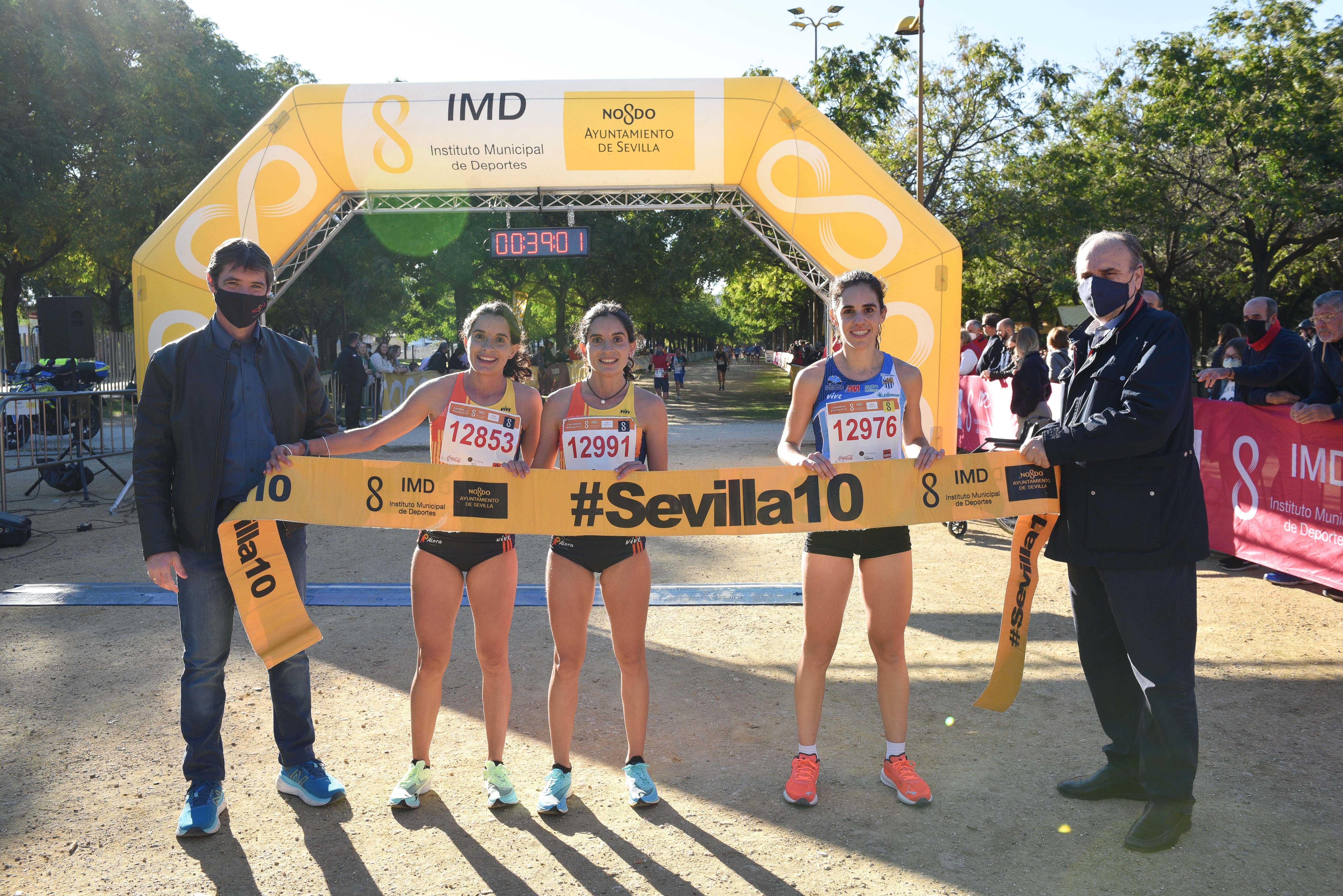 Las tres primeras clasificadas de la Carrera Parque de Miraflores #Sevilla10 2021, tras su llegada a meta.